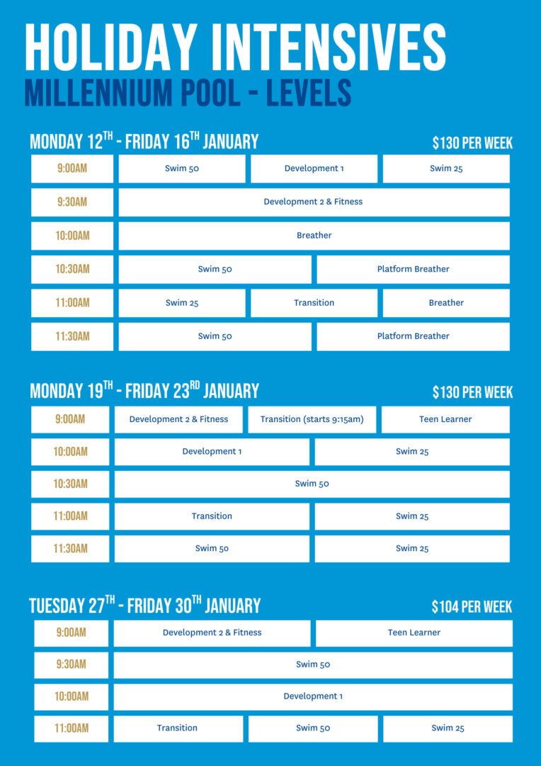 Lessons range from 30 – 60 minutes depending on individual level and are held 3 – 5 days a week in New Zealand’s premier swimming facilities (subject to events and public holidays).